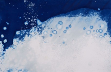 With The Greenland Project,  Ghezzi gives artistic form to the phenomenon of glacial melting, which is transcribed using cyanotype, a specific technique which involves the use of photosensitized paper to detect the rapid changes in ice thickness. Ghezzi placed the photosensitized paper daily beneath slabs of Arctic ice, allowing the photosensitive salts to be washed away by the meltwater from the glacier over a fixed period of time: the paper essentially became a detector of both the condition and the speed of the glacier’s melting.